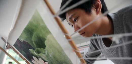 Ma Yinshen observes an embroidery work at Hunan Arts and Crafts Vocational College in Changsha City, capital of central China’s Hunan Province, June 7, 2012.