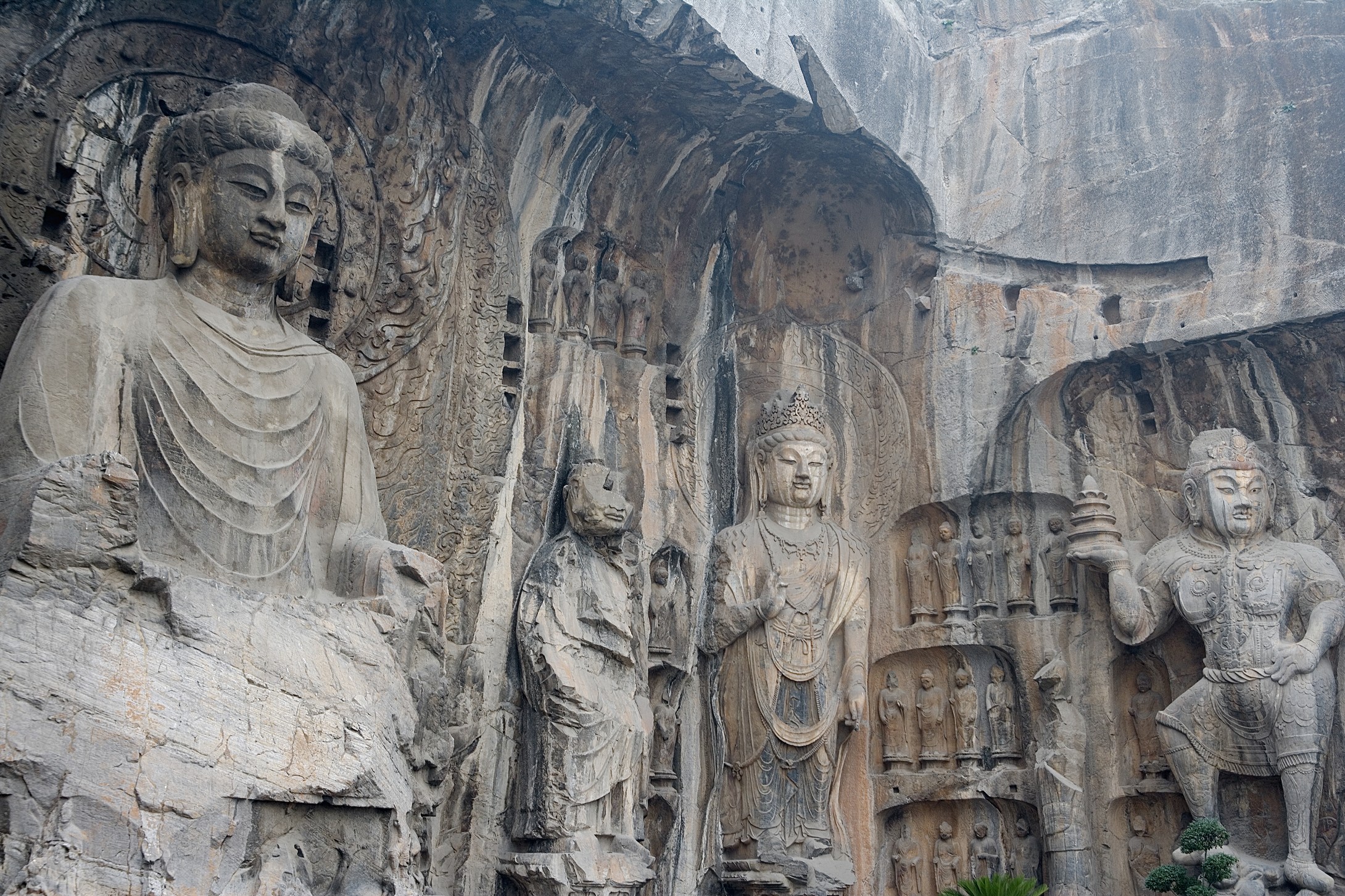 Guyang Cave is recorded as the oldest Longmen cave with carvings in the Northern Wei style, typically of slim and emaciated figures. It is also the largest cave located in the central part of the west hill. It was originally a natural limestone cave. Many of the sculptures inside the cave were contributed by royalty; religious groups supported this activity. The cave has three very large images – the central image is of Sakyamuni Buddha with Bodhisattvas on either side. There are about 800 inscriptions on the walls and in the niches inside the cave, the most in any cave in China. There are two rows of niches on the northern and southern walls of the cave, which house a very large number of images. Decorative carving of niches is also very beautiful, especially manifested in the design of shape, lintel and tablet of niches, colorful and varied.